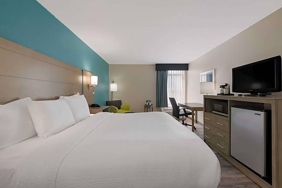 This king room features a flat screen TV, microwave and refrigerator.